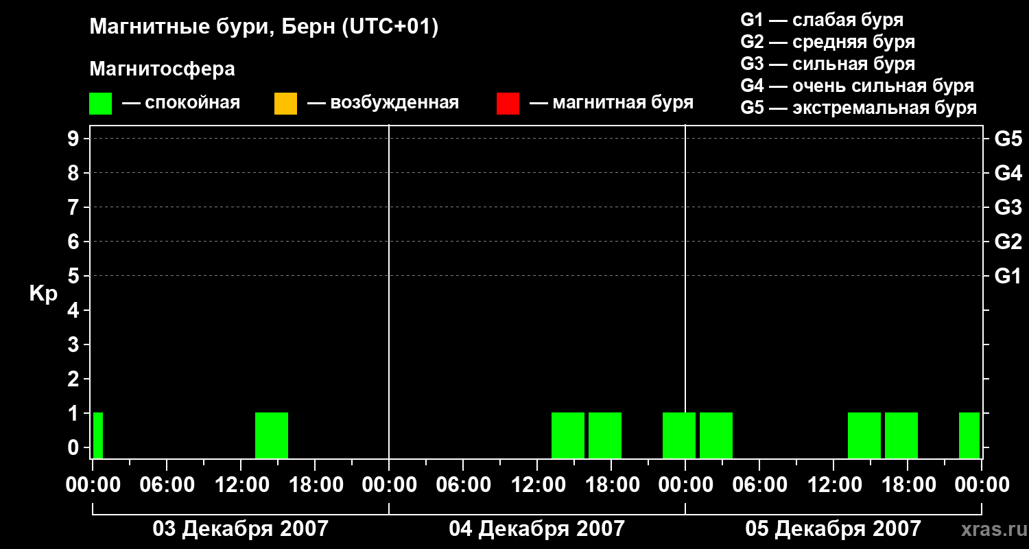 Изменения геомагнитного индекса Kp с 3 по 5 декабря 2007 года для средних широт