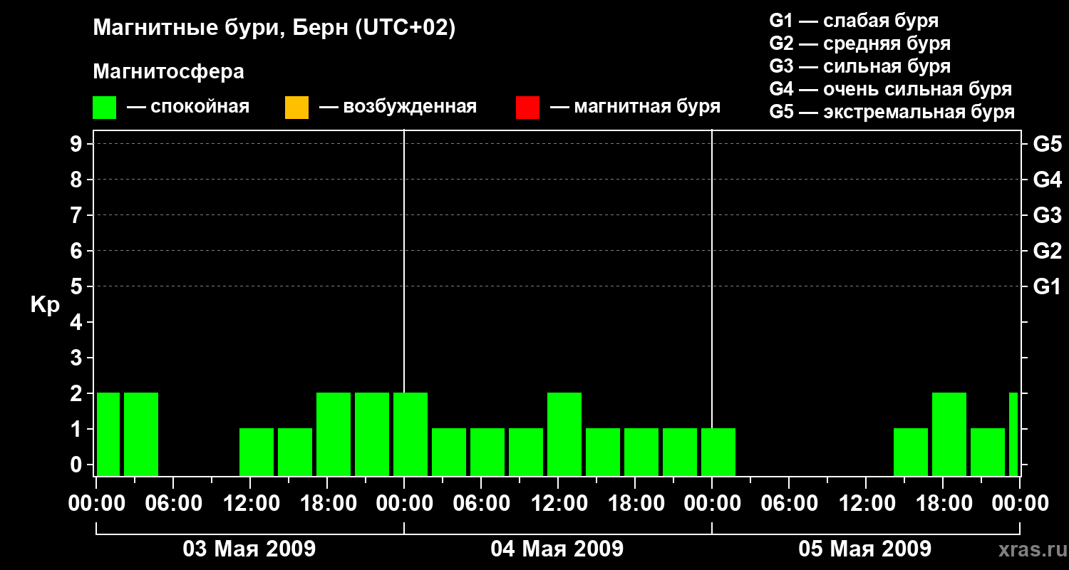 Изменения геомагнитного индекса Kp с 3 по 5 мая 2009 года для средних широт