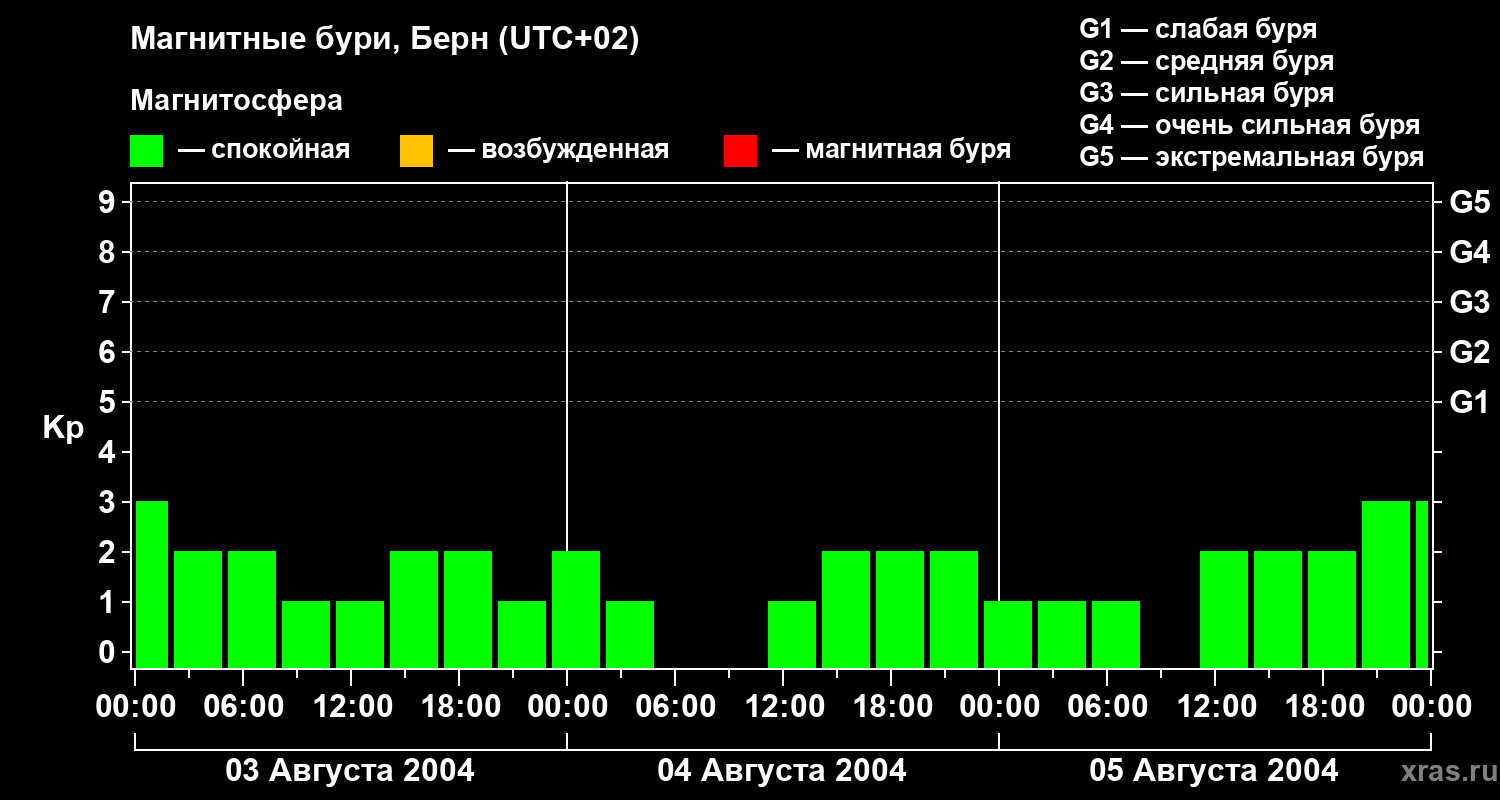 Изменения геомагнитного индекса Kp с 3 по 5 августа 2004 года для средних широт