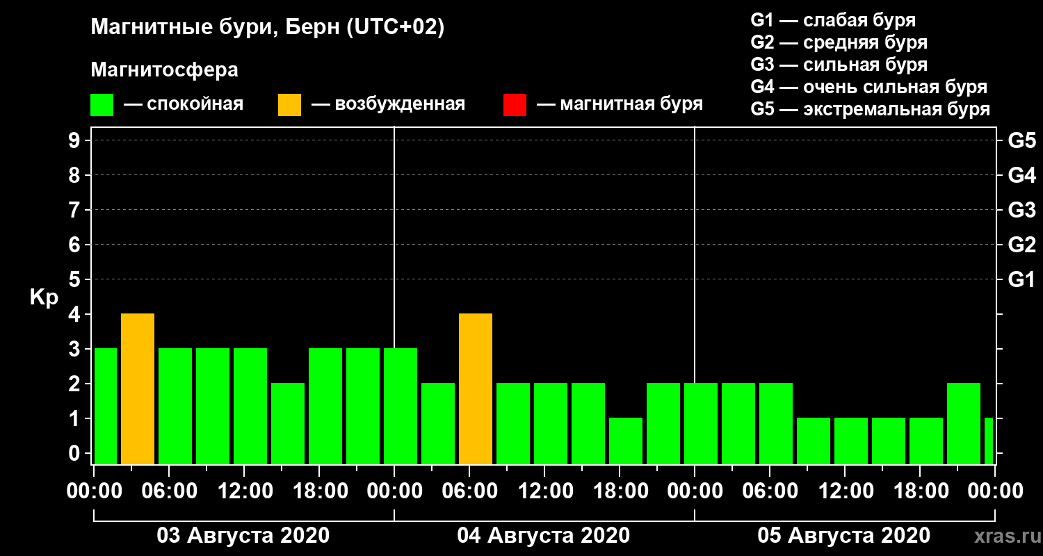 Изменения геомагнитного индекса Kp с 3 по 5 августа 2020 года для средних широт
