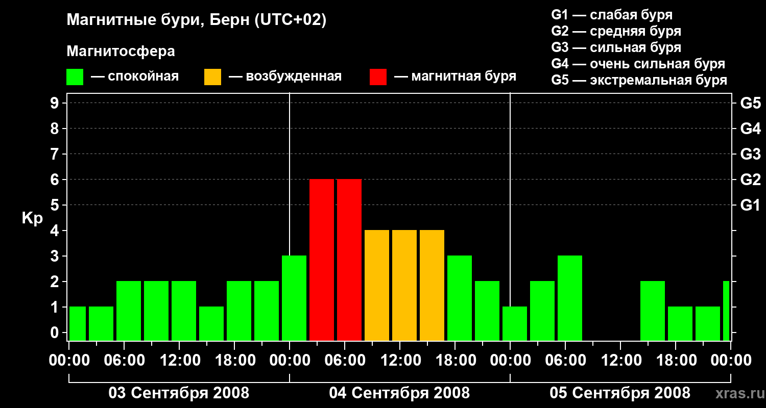 Изменения геомагнитного индекса Kp с 3 по 5 сентября 2008 года для средних широт