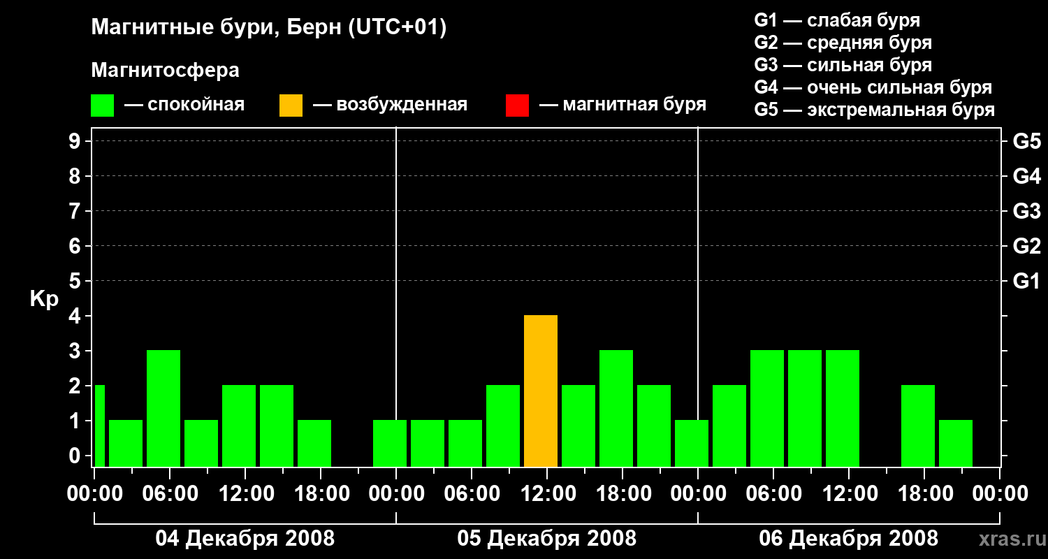 Изменения геомагнитного индекса Kp с 4 по 6 декабря 2008 года для средних широт