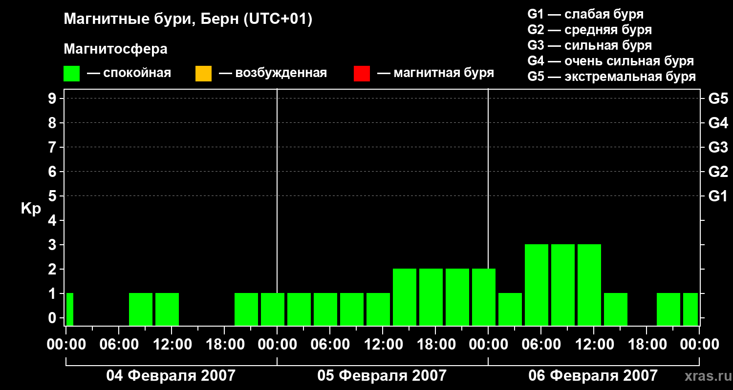 Изменения геомагнитного индекса Kp с 4 по 6 февраля 2007 года для средних широт