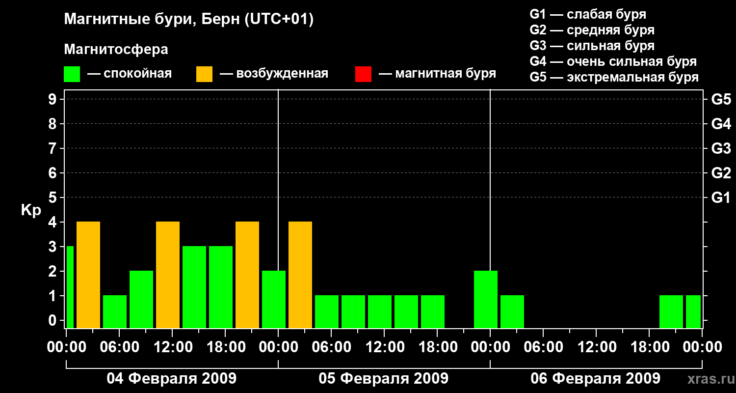 Изменения геомагнитного индекса Kp с 4 по 6 февраля 2009 года для средних широт