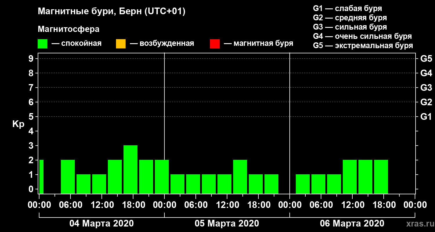 Изменения геомагнитного индекса Kp с 4 по 6 марта 2020 года для средних широт