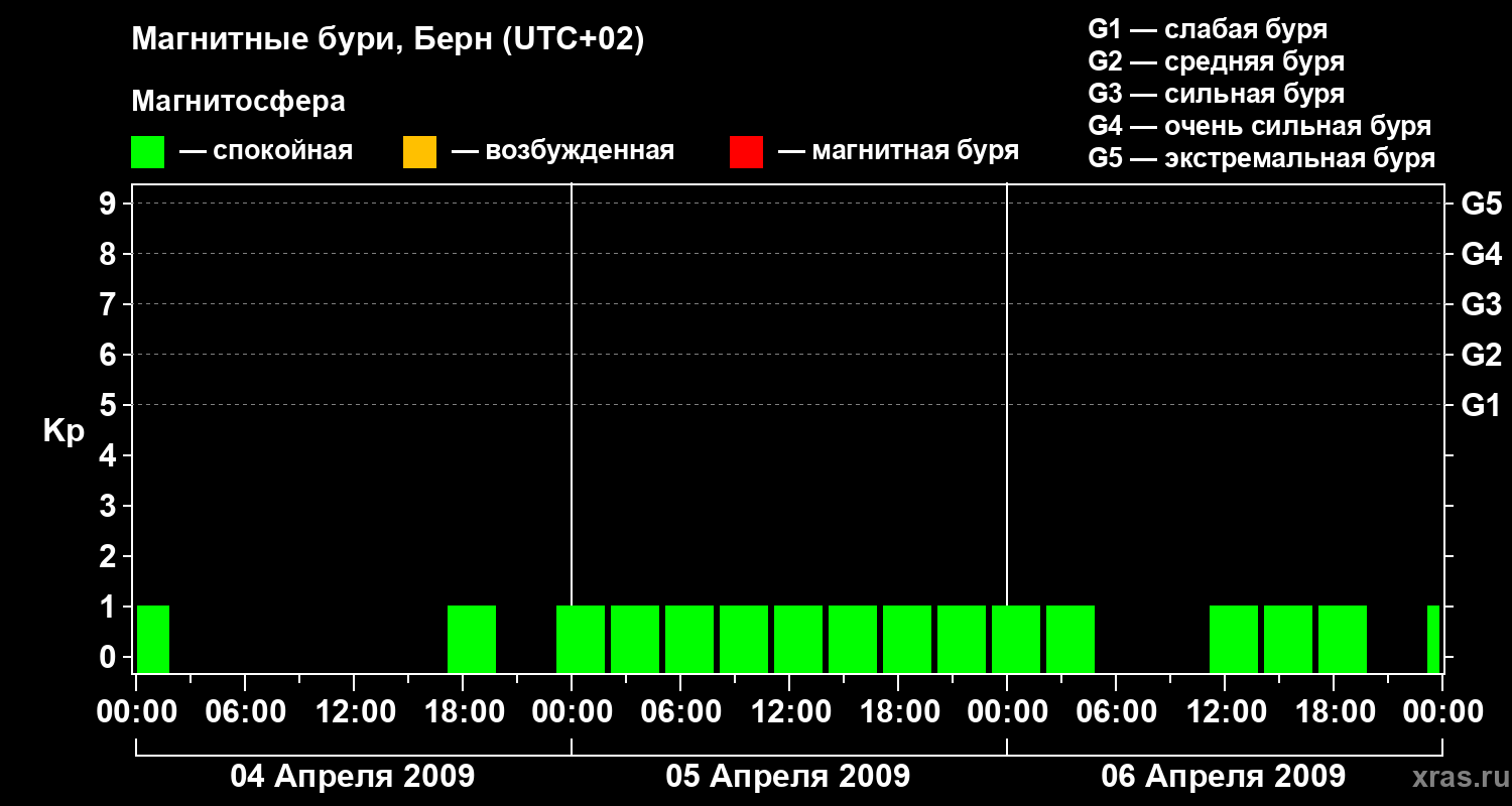 Изменения геомагнитного индекса Kp с 4 по 6 апреля 2009 года для средних широт