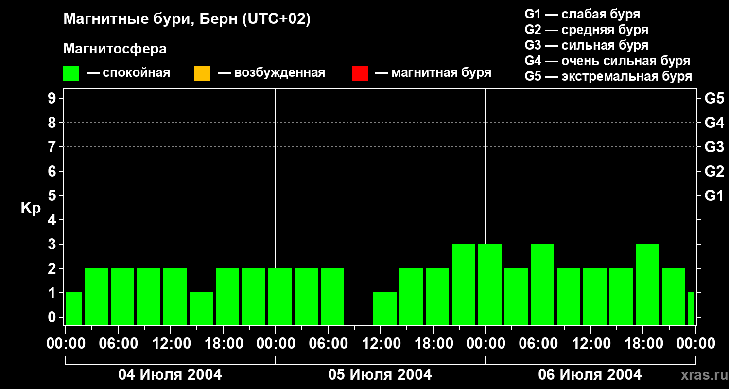 Изменения геомагнитного индекса Kp с 4 по 6 июля 2004 года для средних широт