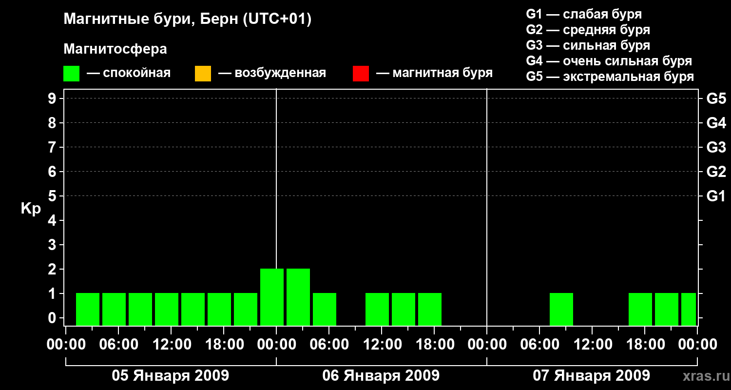 Изменения геомагнитного индекса Kp с 5 по 7 января 2009 года для средних широт