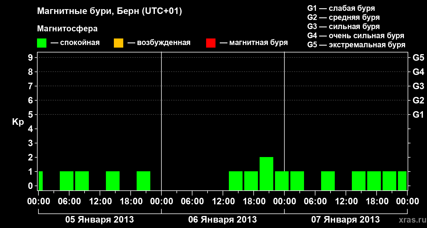 Изменения геомагнитного индекса Kp с 5 по 7 января 2013 года для средних широт