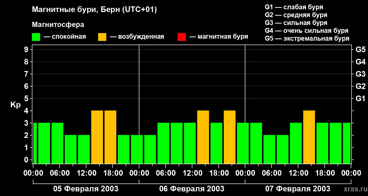 Изменения геомагнитного индекса Kp с 5 по 7 февраля 2003 года для средних широт
