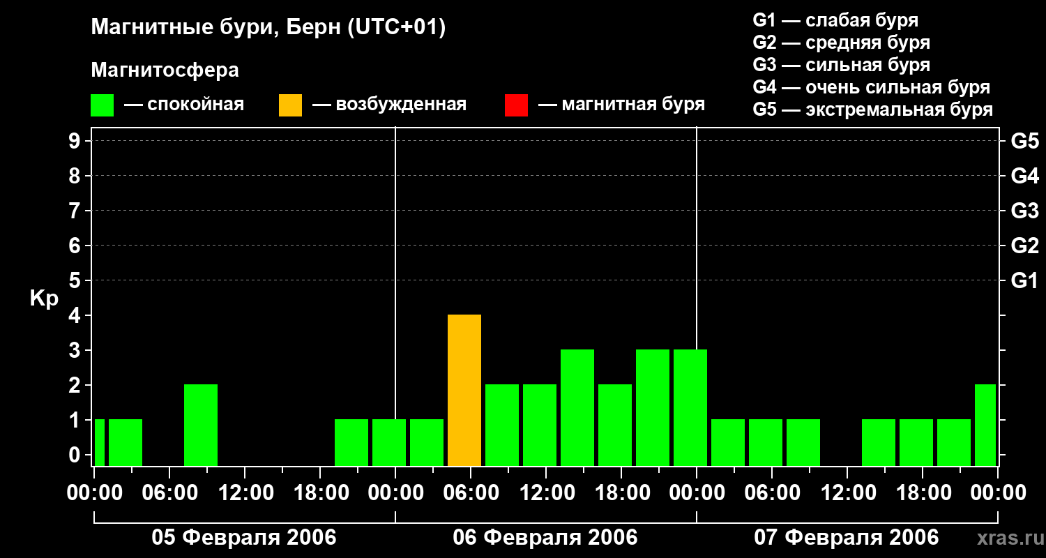 Изменения геомагнитного индекса Kp с 5 по 7 февраля 2006 года для средних широт