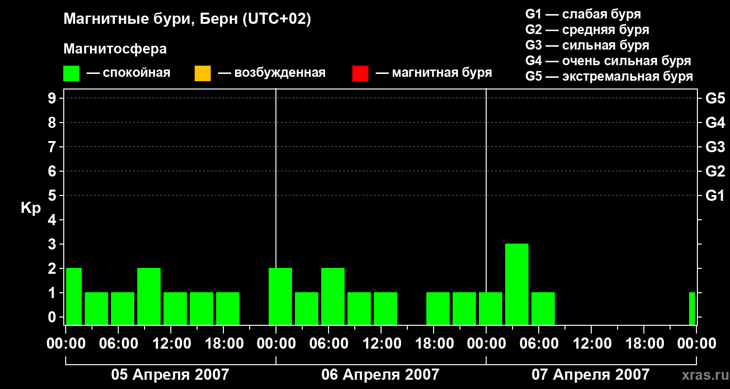 Изменения геомагнитного индекса Kp с 5 по 7 апреля 2007 года для средних широт