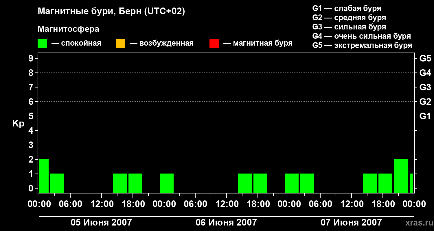 Изменения геомагнитного индекса Kp с 5 по 7 июня 2007 года для средних широт