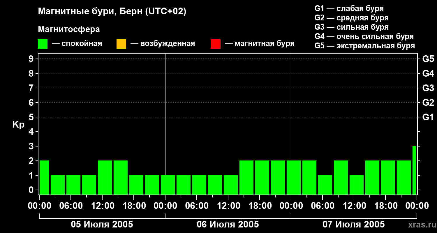 Изменения геомагнитного индекса Kp с 5 по 7 июля 2005 года для средних широт