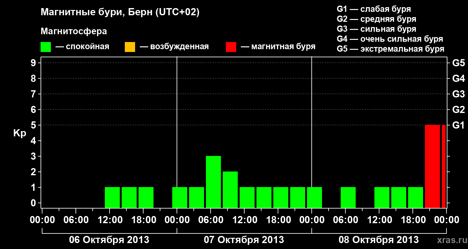 Изменения геомагнитного индекса Kp с 6 по 8 октября 2013 года для средних широт