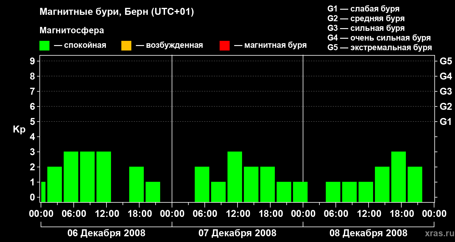 Изменения геомагнитного индекса Kp с 6 по 8 декабря 2008 года для средних широт