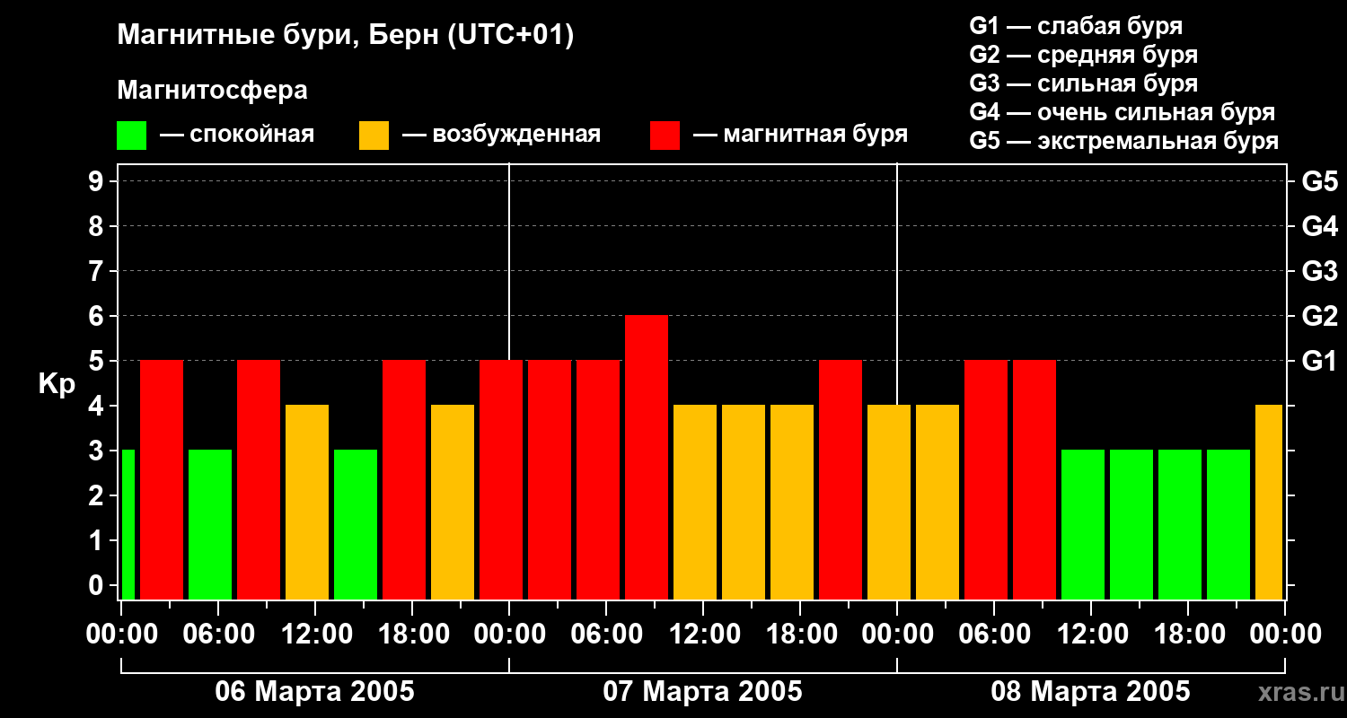 Изменения геомагнитного индекса Kp с 6 по 8 марта 2005 года для средних широт