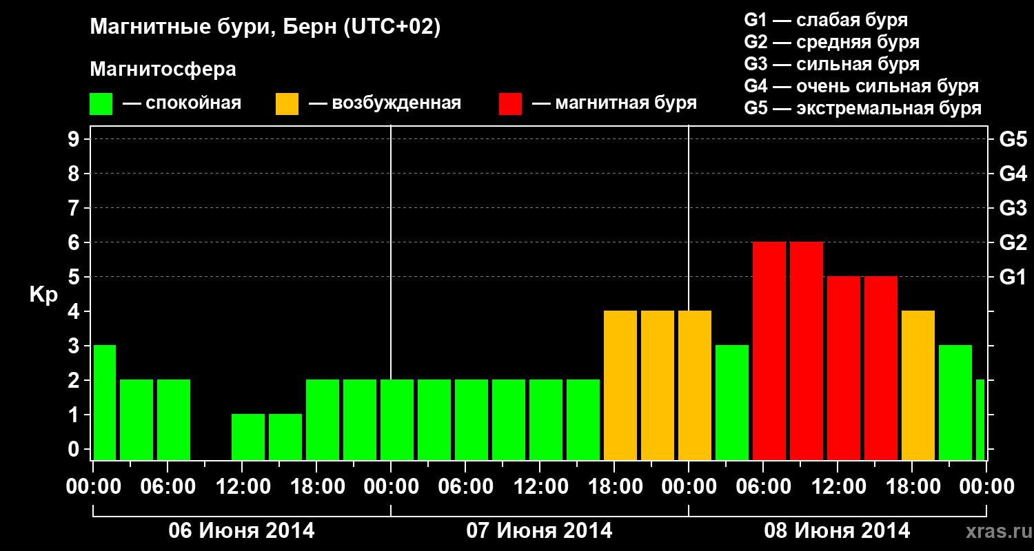 Изменения геомагнитного индекса Kp с 6 по 8 июня 2014 года для средних широт