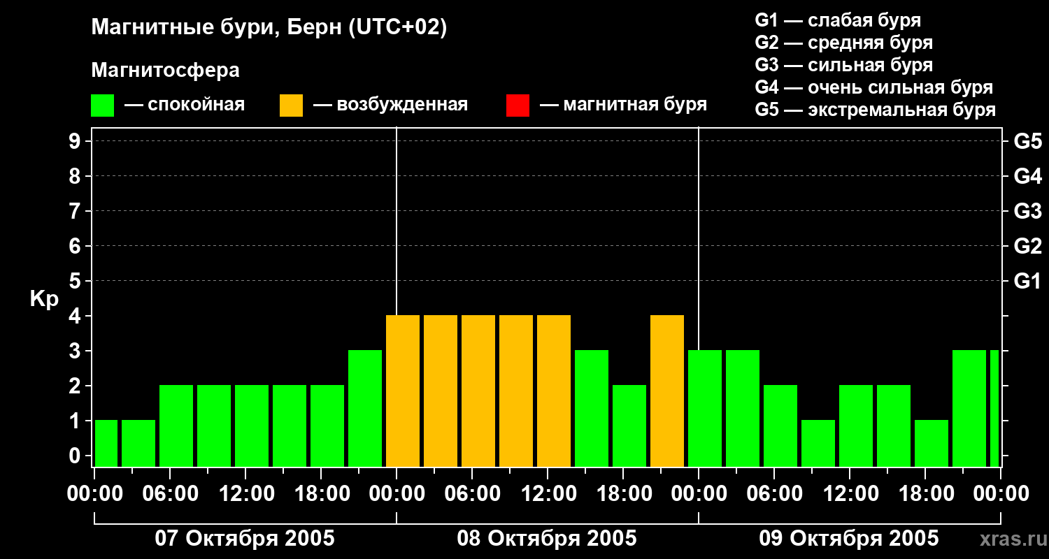 Изменения геомагнитного индекса Kp с 7 по 9 октября 2005 года для средних широт