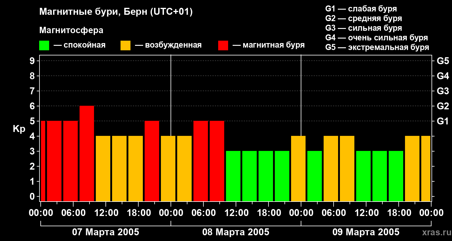Изменения геомагнитного индекса Kp с 7 по 9 марта 2005 года для средних широт