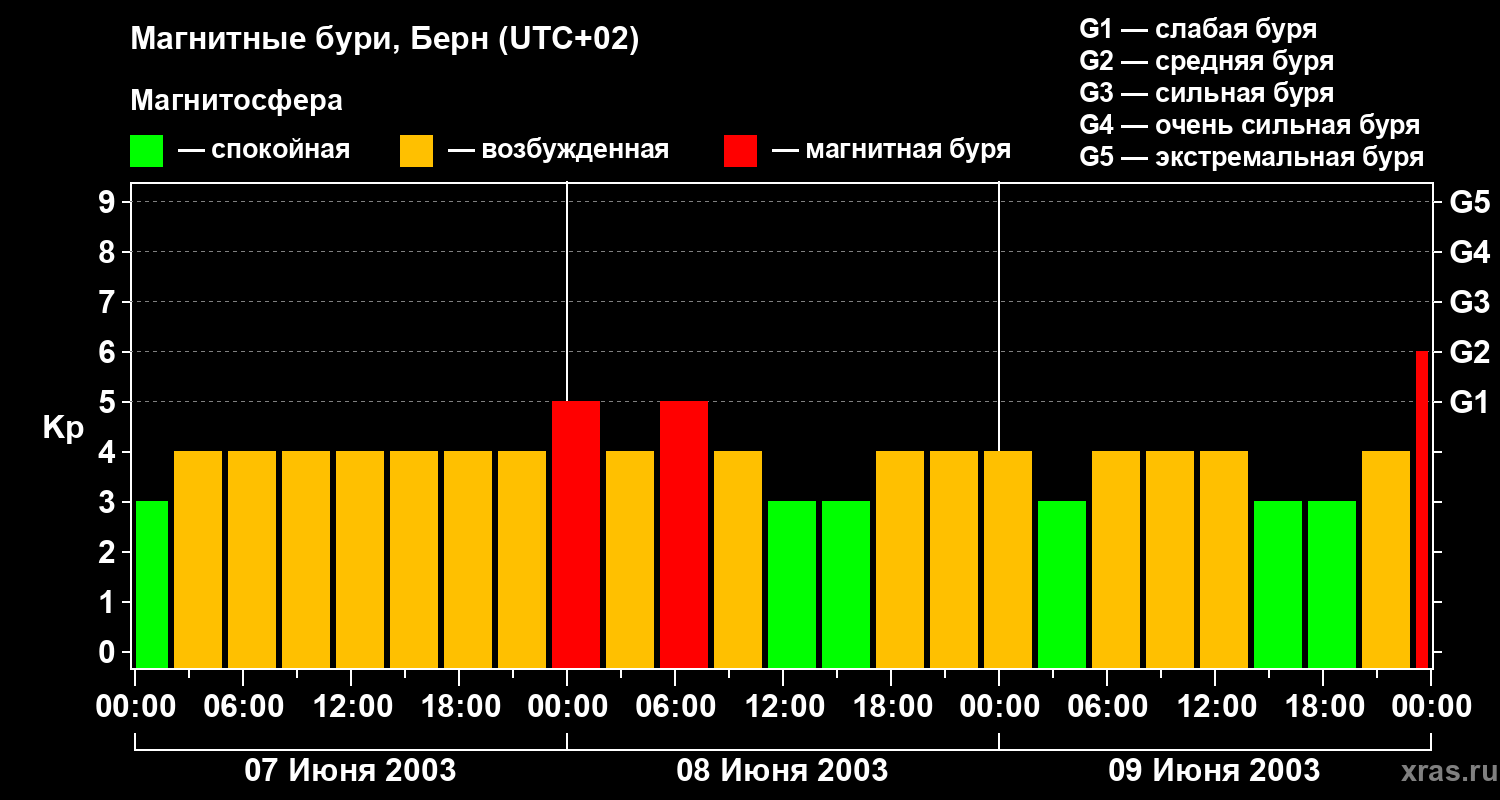 Изменения геомагнитного индекса Kp с 7 по 9 июня 2003 года для средних широт