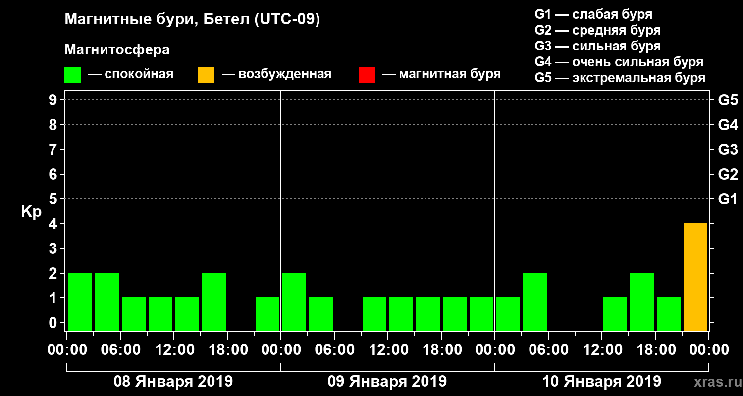 Изменения геомагнитного индекса Kp с 8 по 10 января 2019 года для средних широт