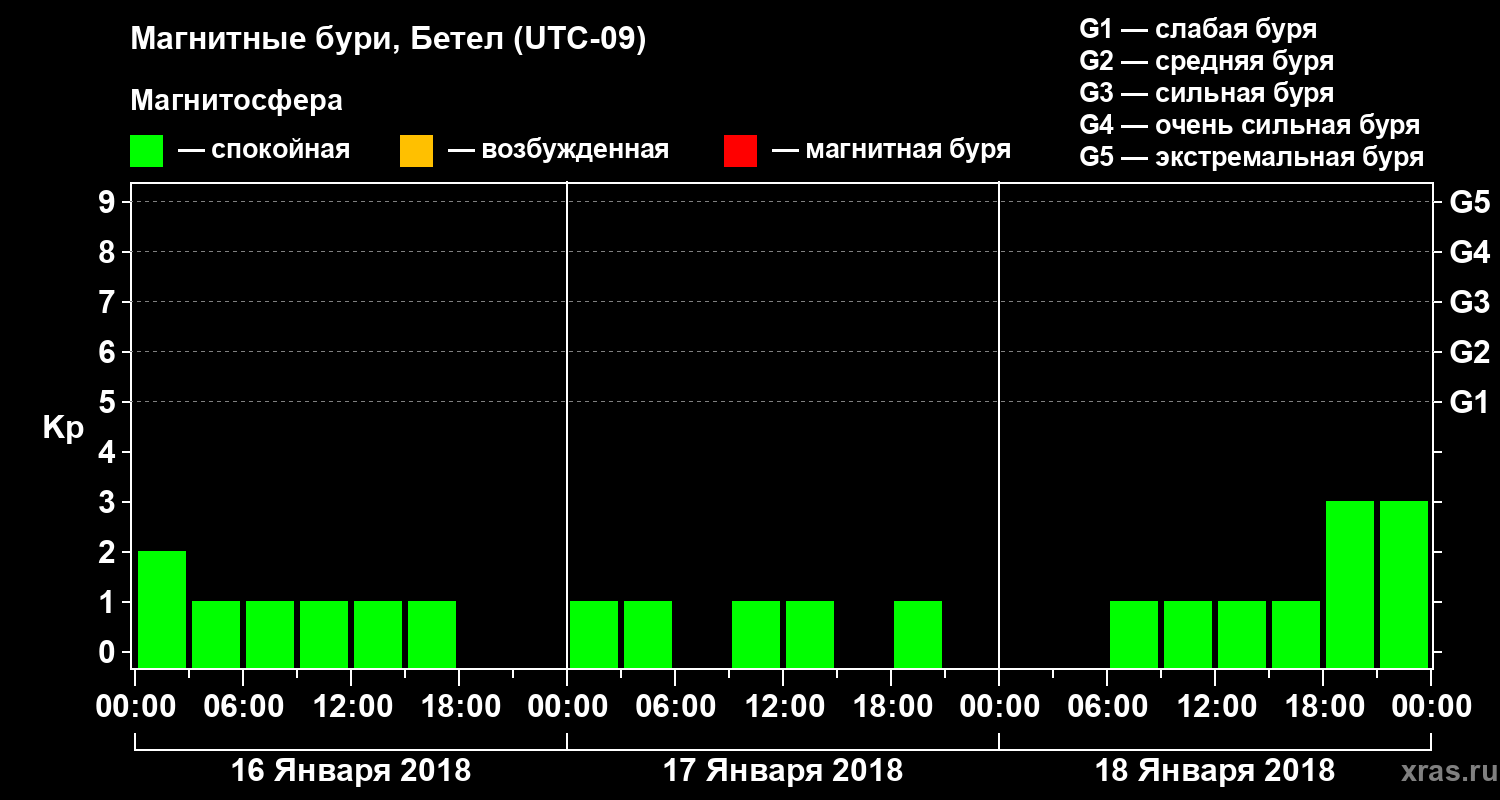 Изменения геомагнитного индекса Kp с 16 по 18 января 2018 года для средних широт