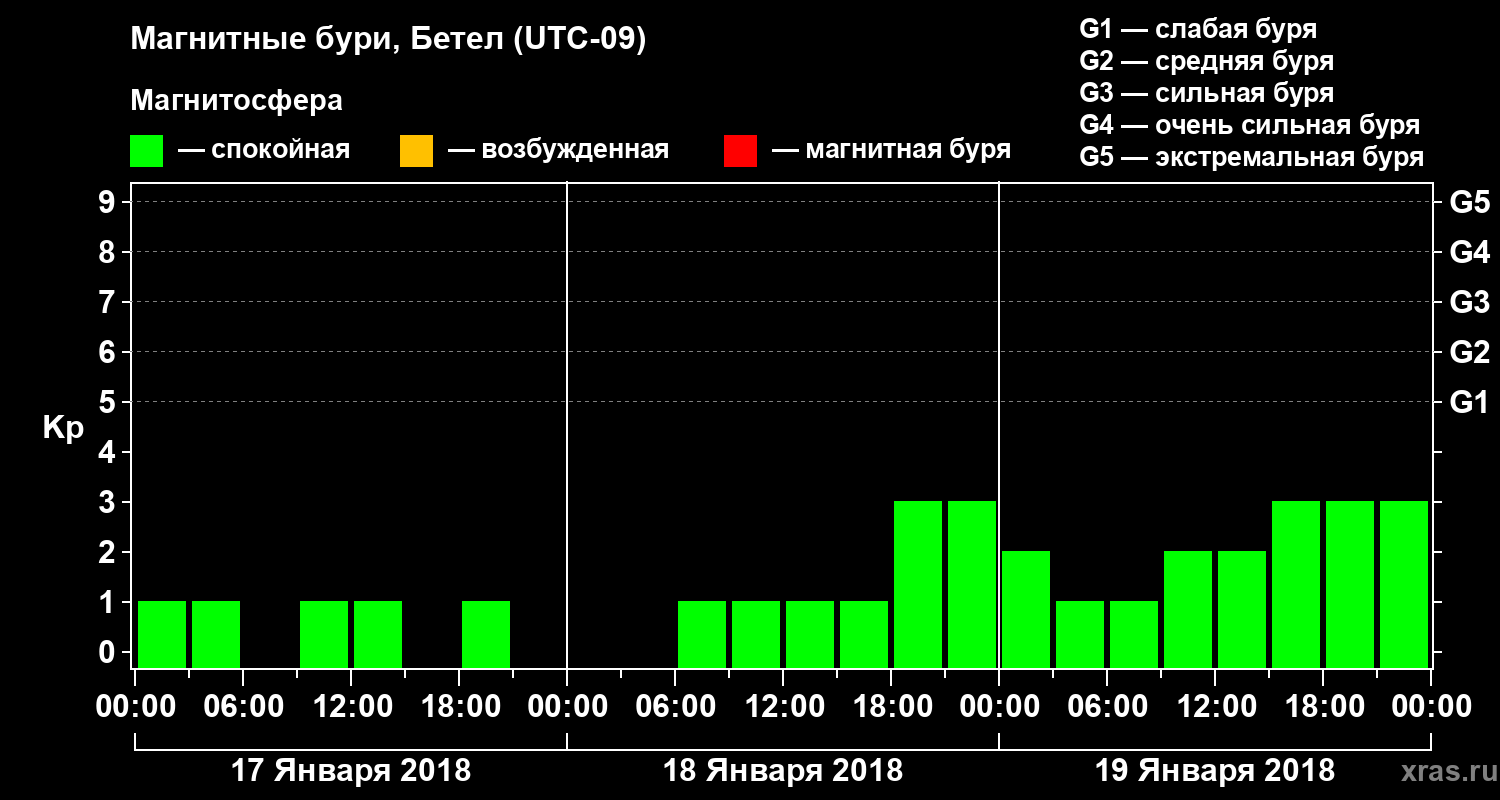 Изменения геомагнитного индекса Kp с 17 по 19 января 2018 года для средних широт
