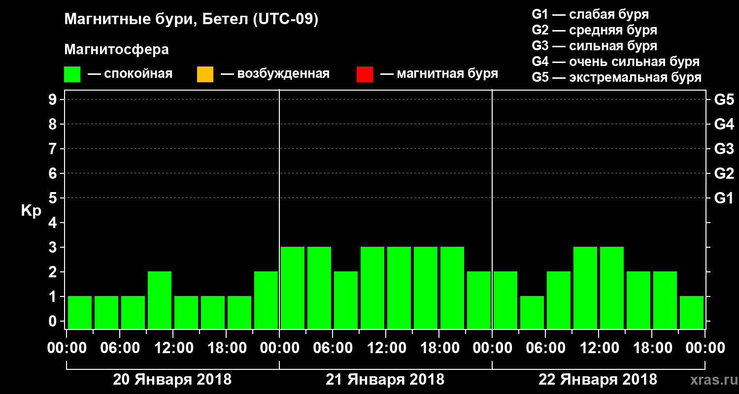 Изменения геомагнитного индекса Kp с 20 по 22 января 2018 года для средних широт