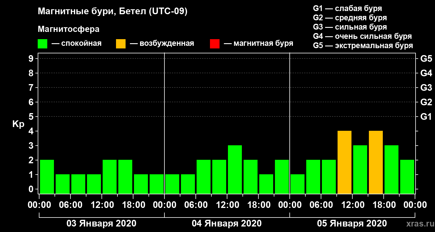 Изменения геомагнитного индекса Kp с 3 по 5 января 2020 года для средних широт