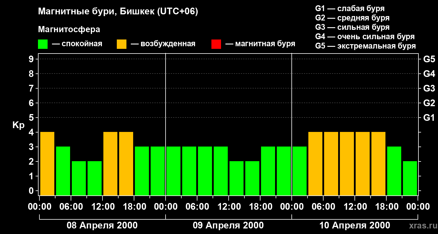 Изменения геомагнитного индекса Kp с 8 по 10 апреля 2000 года для средних широт