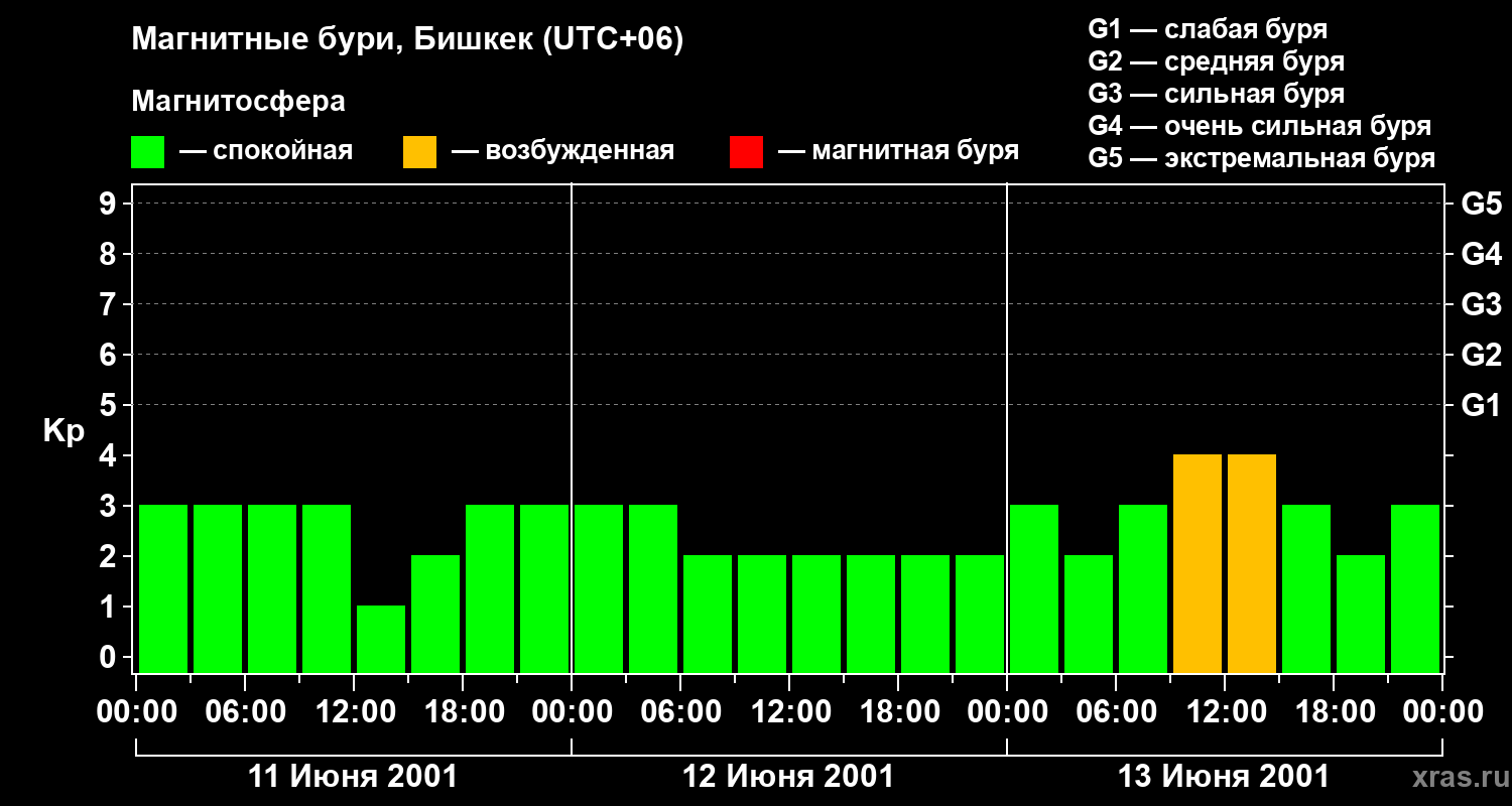 Изменения геомагнитного индекса Kp с 11 по 13 июня 2001 года для средних широт