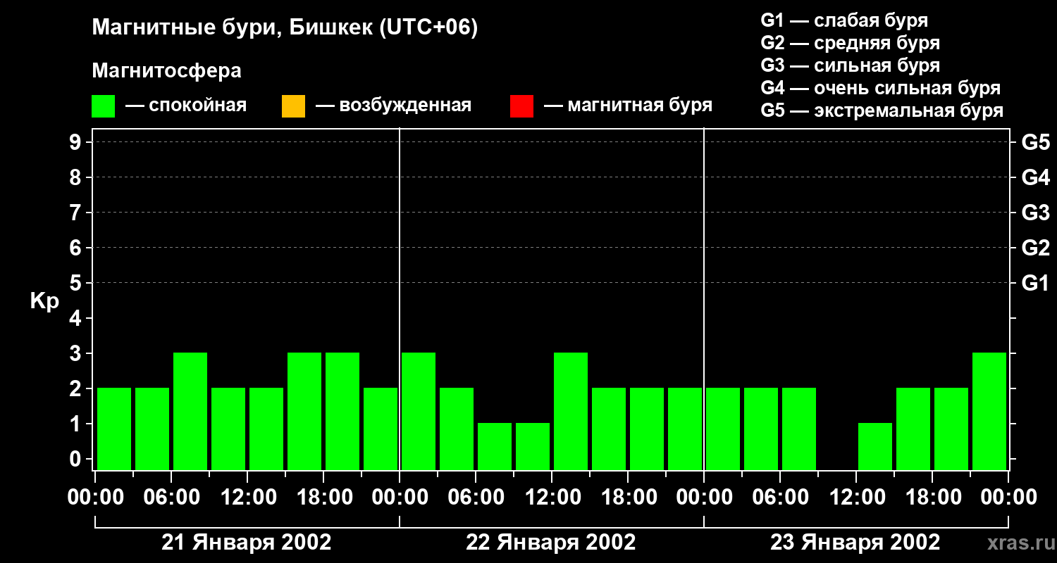 Изменения геомагнитного индекса Kp с 21 по 23 января 2002 года для средних широт