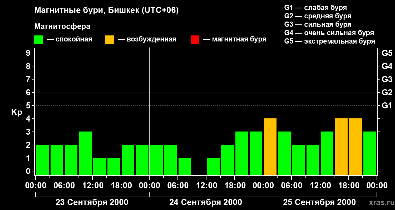 Изменения геомагнитного индекса Kp с 23 по 25 сентября 2000 года для средних широт