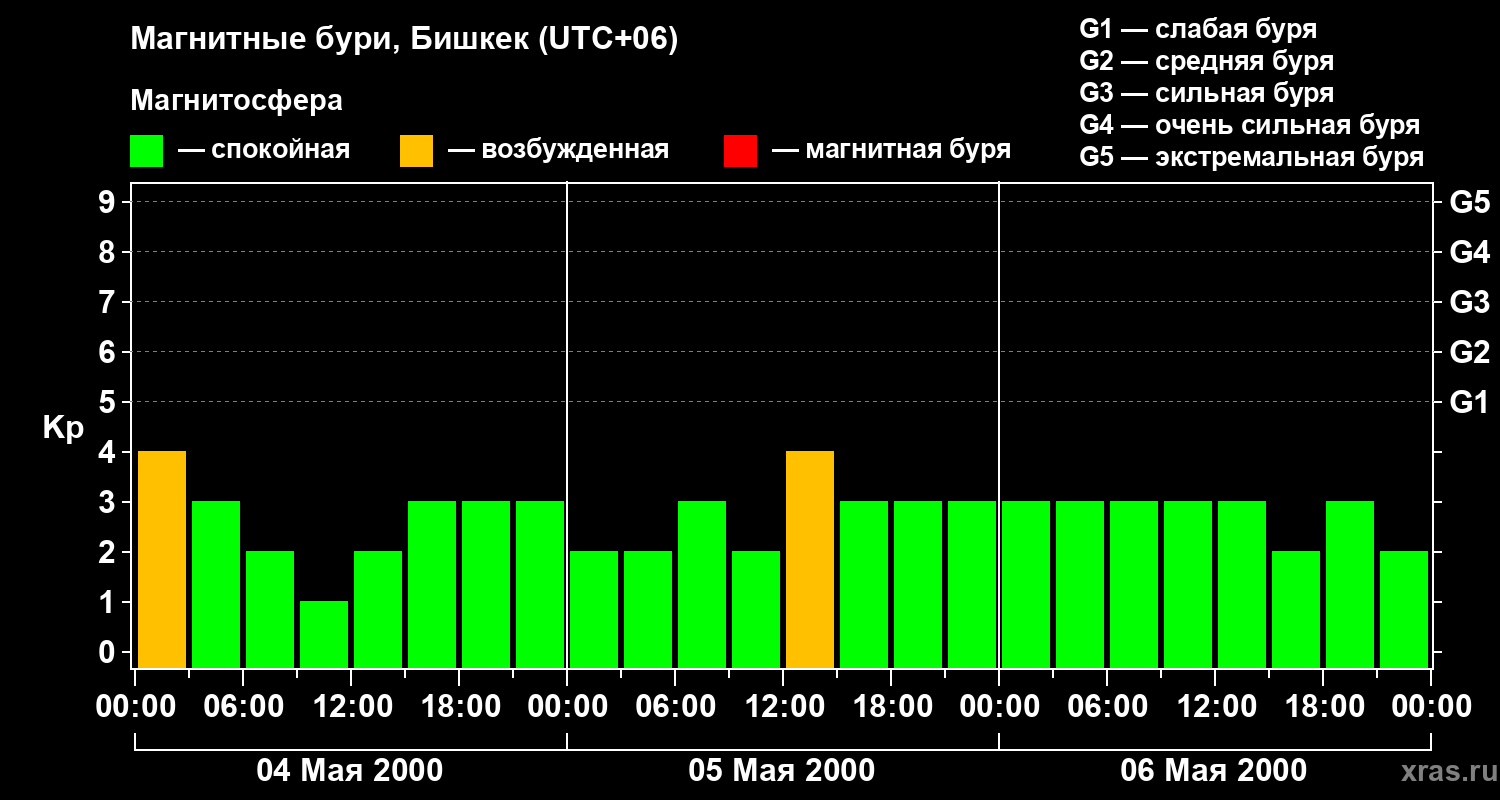 Изменения геомагнитного индекса Kp с 4 по 6 мая 2000 года для средних широт