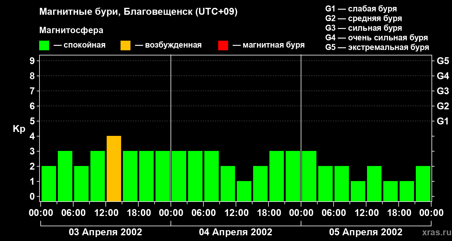 Изменения геомагнитного индекса Kp с 3 по 5 апреля 2002 года для средних широт