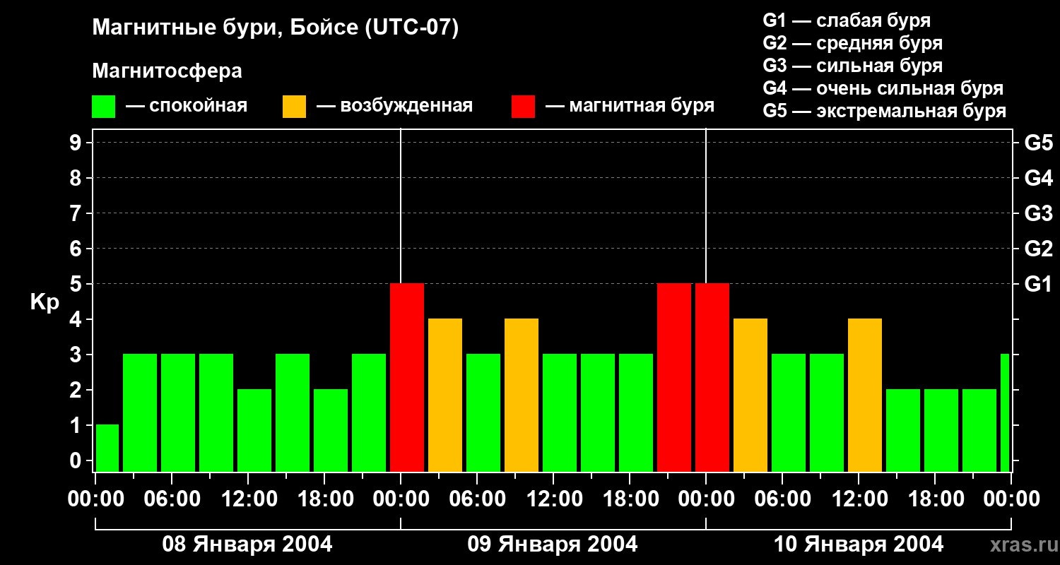 Изменения геомагнитного индекса Kp с 8 по 10 января 2004 года для средних широт