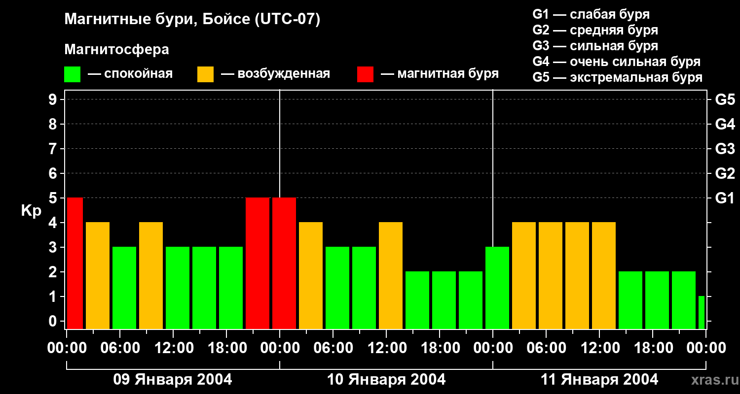 Изменения геомагнитного индекса Kp с 9 по 11 января 2004 года для средних широт
