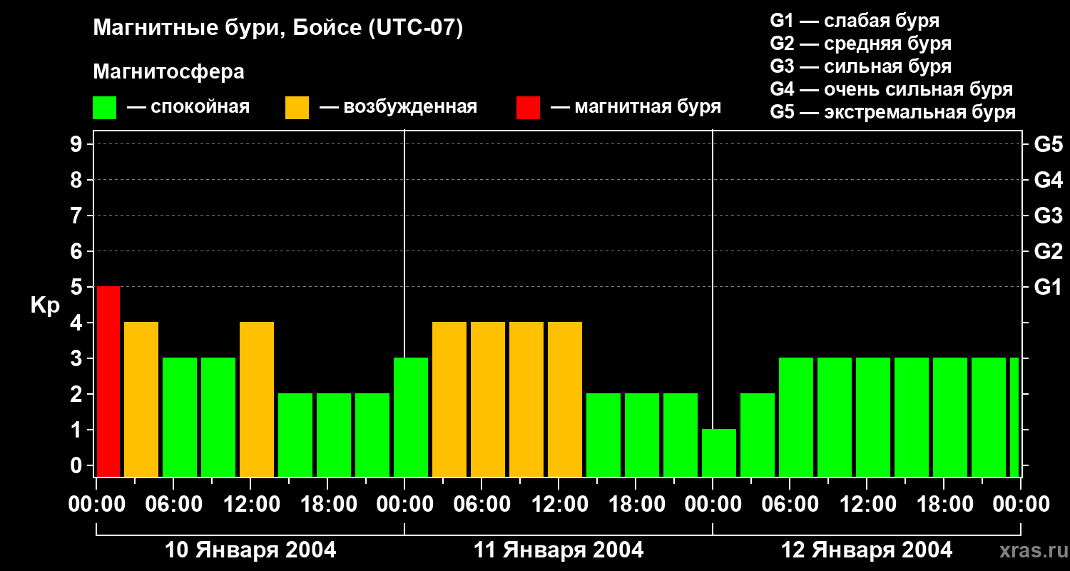 Изменения геомагнитного индекса Kp с 10 по 12 января 2004 года для средних широт