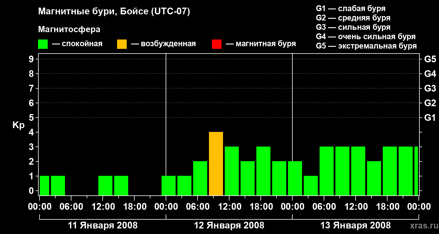 Изменения геомагнитного индекса Kp с 11 по 13 января 2008 года для средних широт