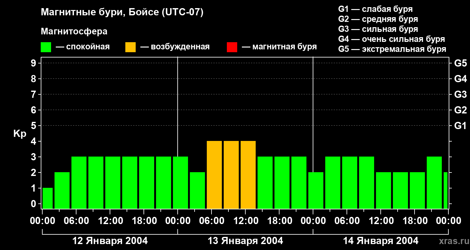 Изменения геомагнитного индекса Kp с 12 по 14 января 2004 года для средних широт