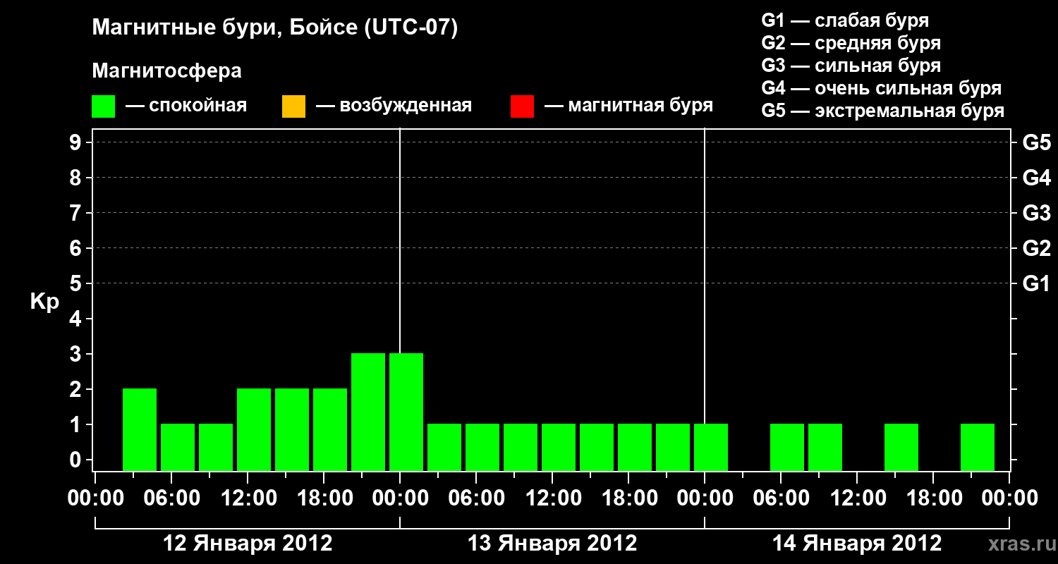 Изменения геомагнитного индекса Kp с 12 по 14 января 2012 года для средних широт