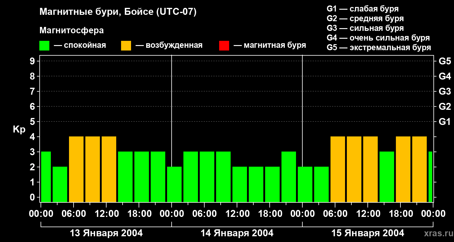 Изменения геомагнитного индекса Kp с 13 по 15 января 2004 года для средних широт