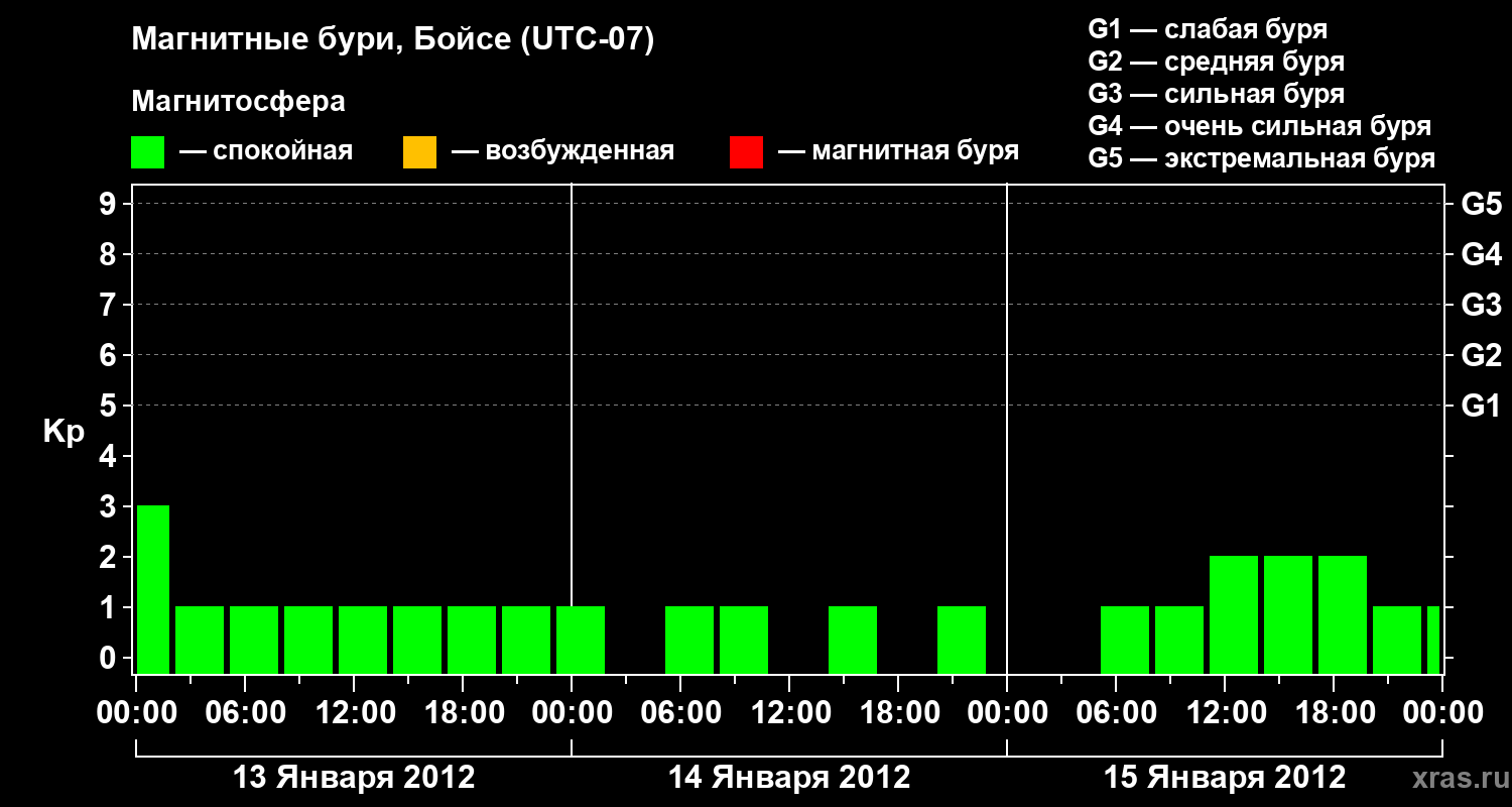 Изменения геомагнитного индекса Kp с 13 по 15 января 2012 года для средних широт