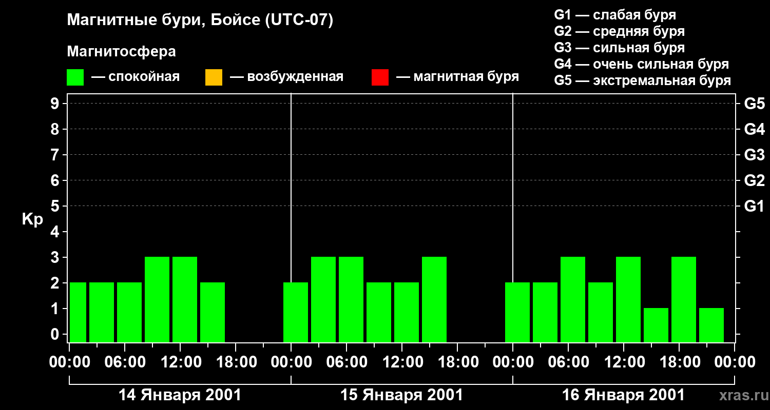 Изменения геомагнитного индекса Kp с 14 по 16 января 2001 года для средних широт