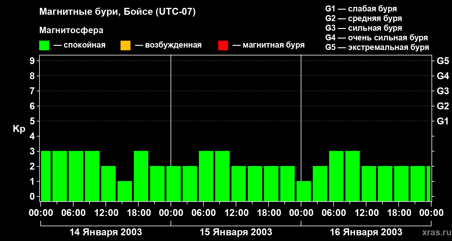 Изменения геомагнитного индекса Kp с 14 по 16 января 2003 года для средних широт