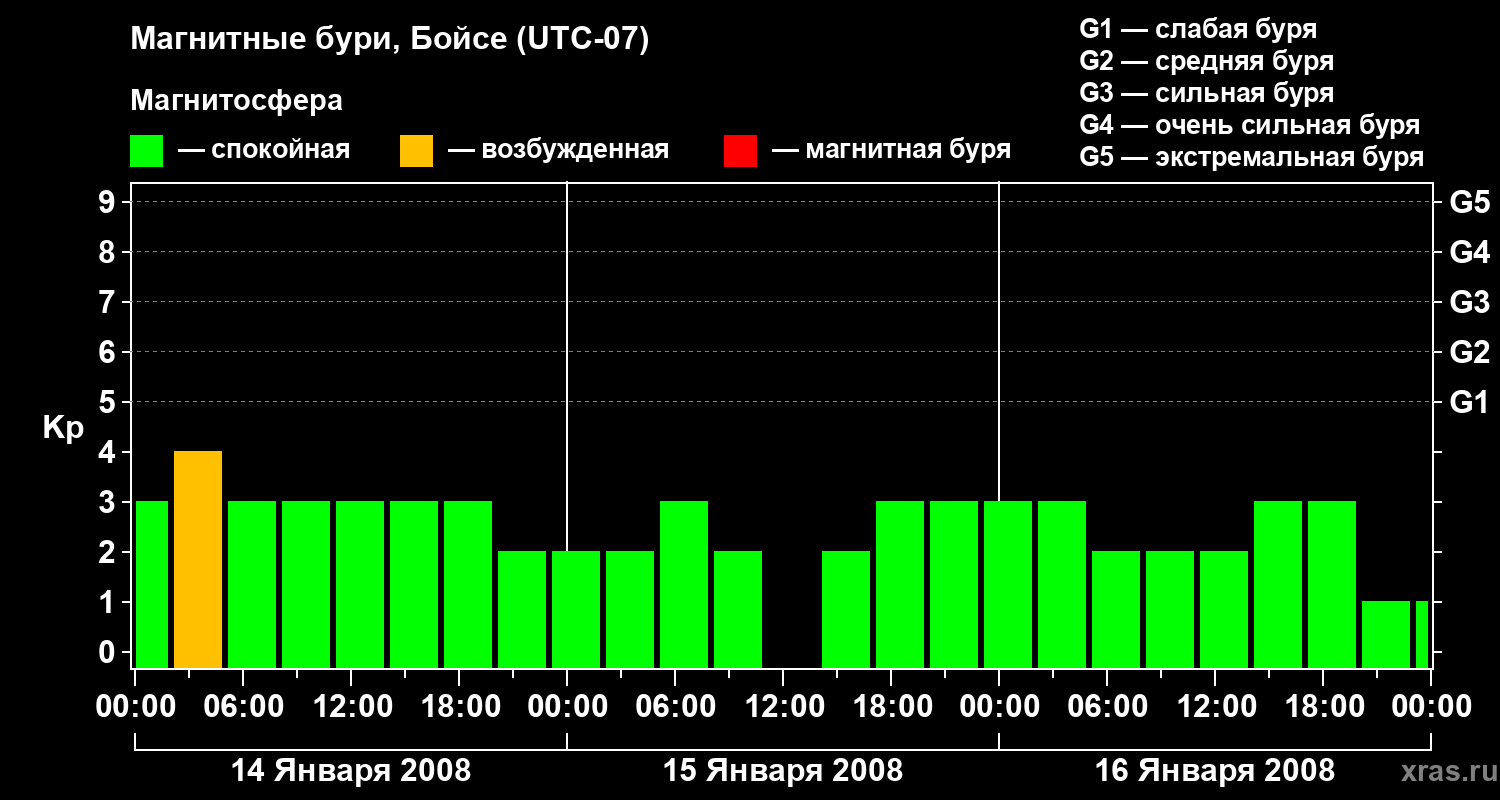 Изменения геомагнитного индекса Kp с 14 по 16 января 2008 года для средних широт