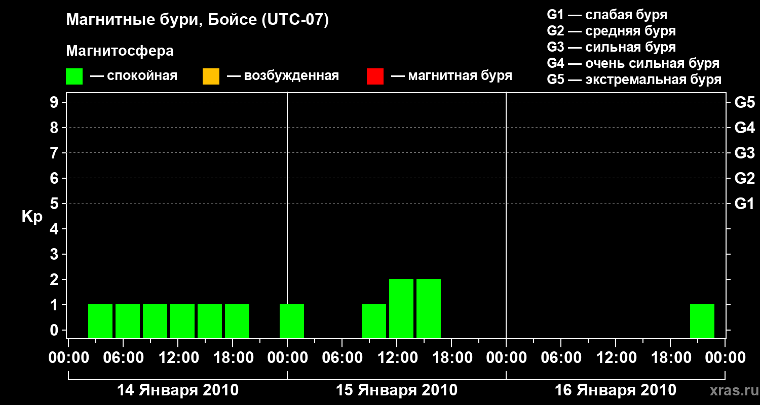 Изменения геомагнитного индекса Kp с 14 по 16 января 2010 года для средних широт
