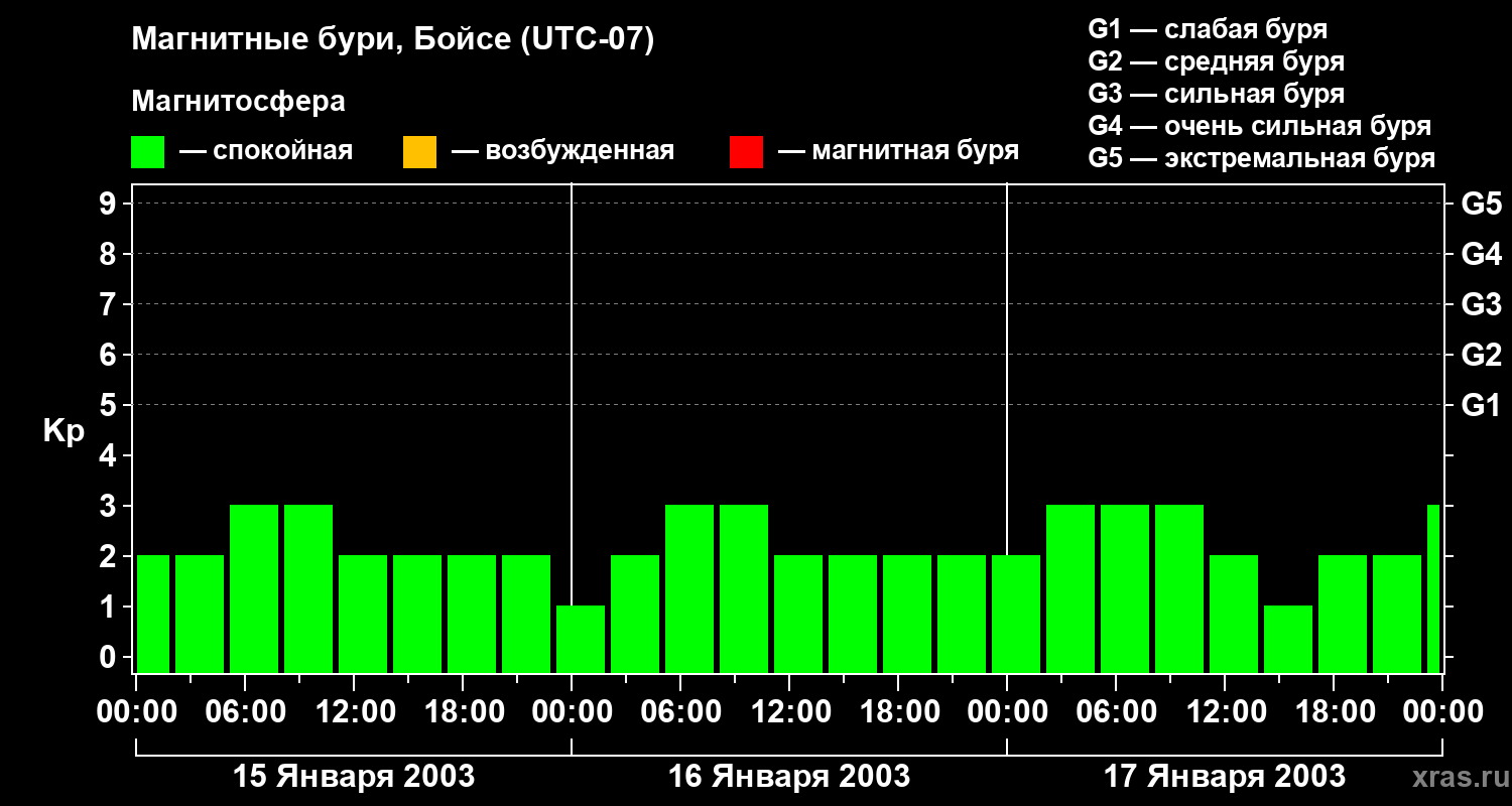 Изменения геомагнитного индекса Kp с 15 по 17 января 2003 года для средних широт