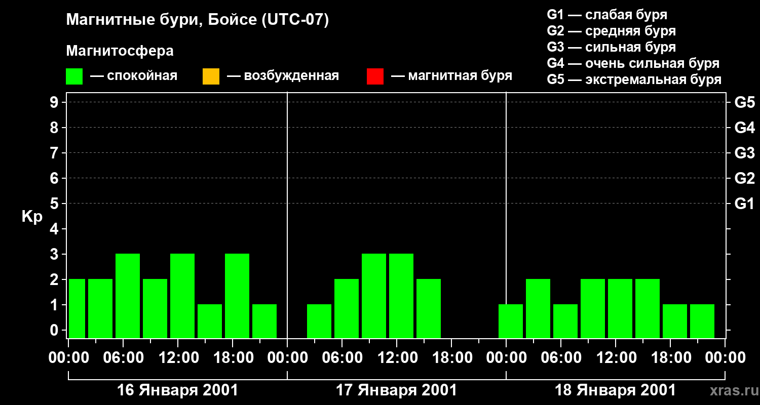 Изменения геомагнитного индекса Kp с 16 по 18 января 2001 года для средних широт